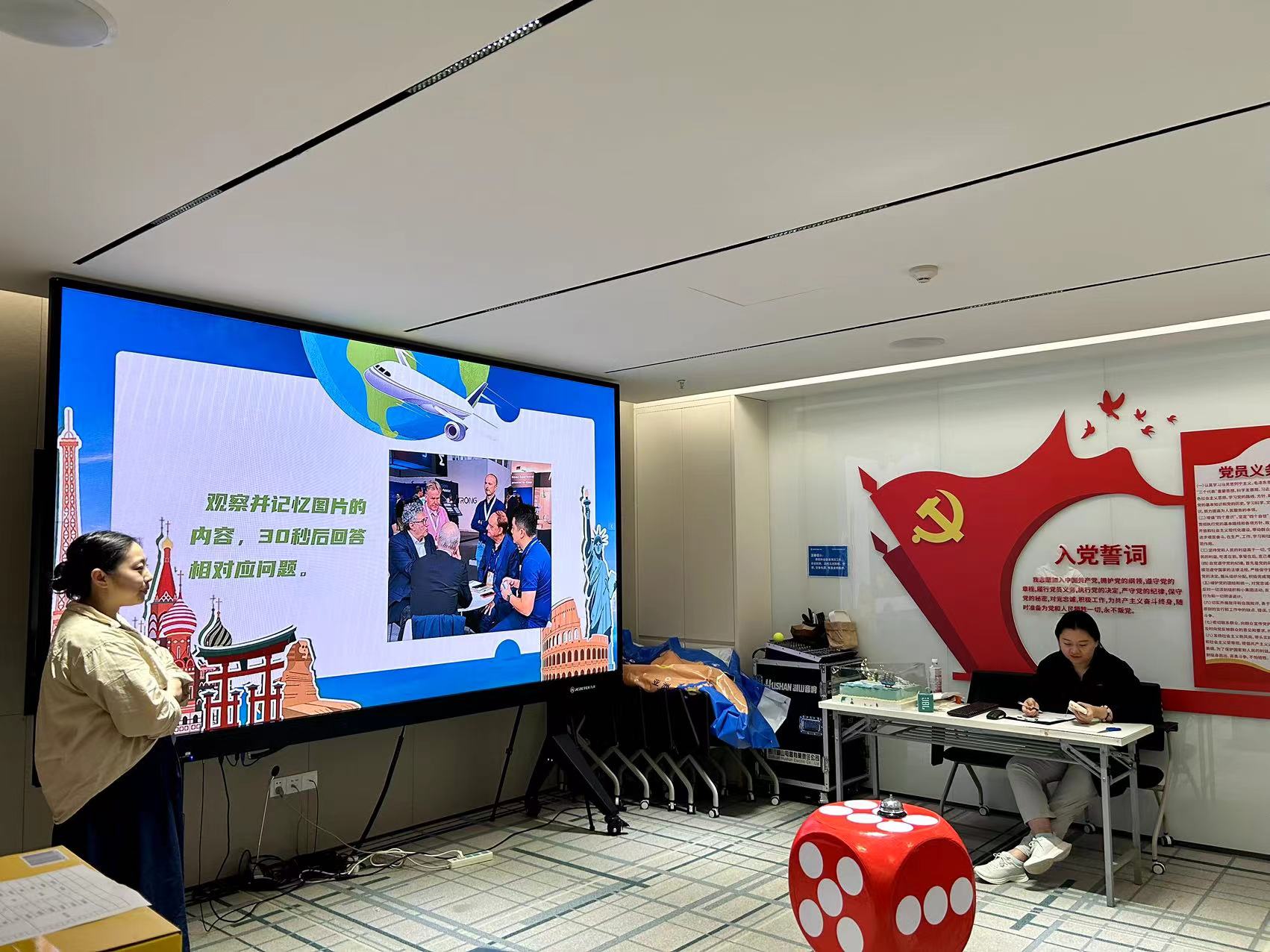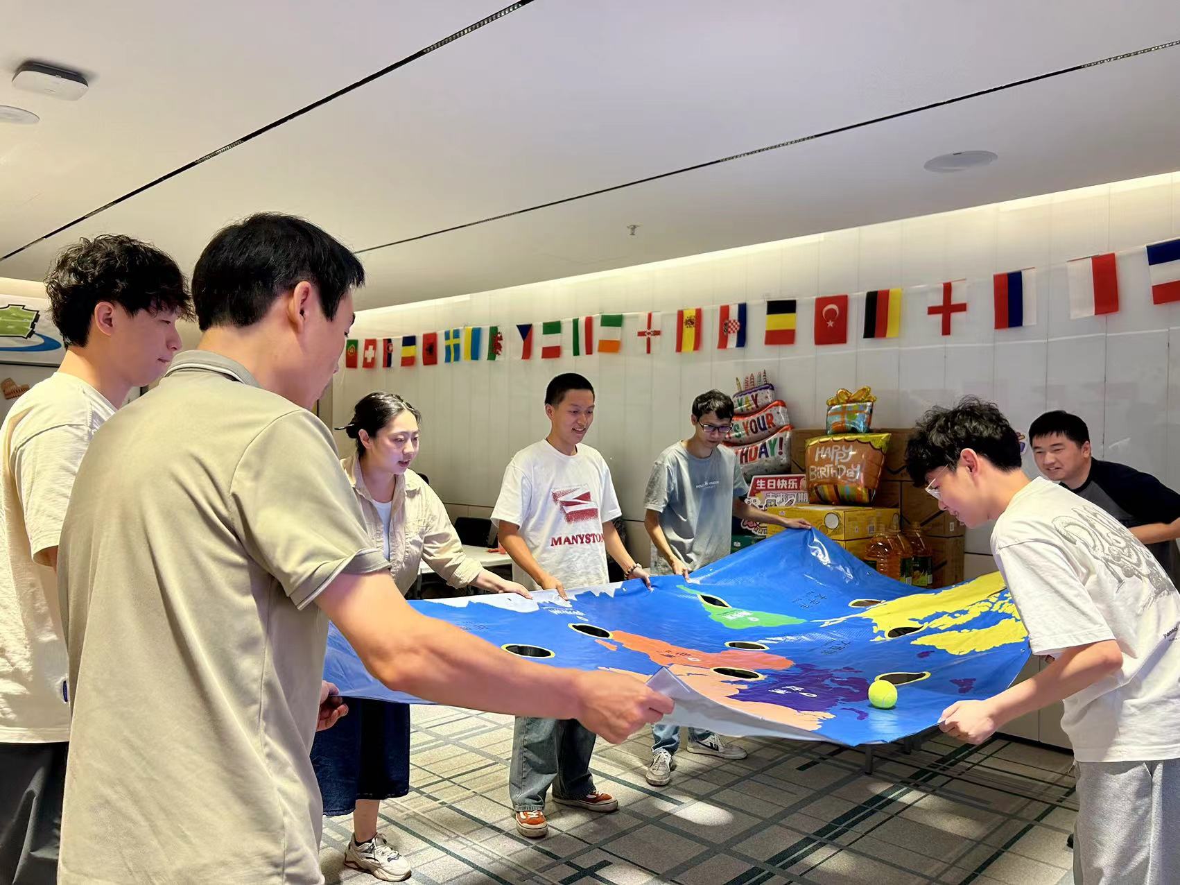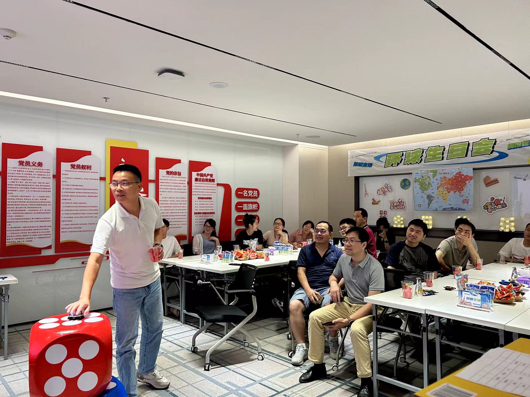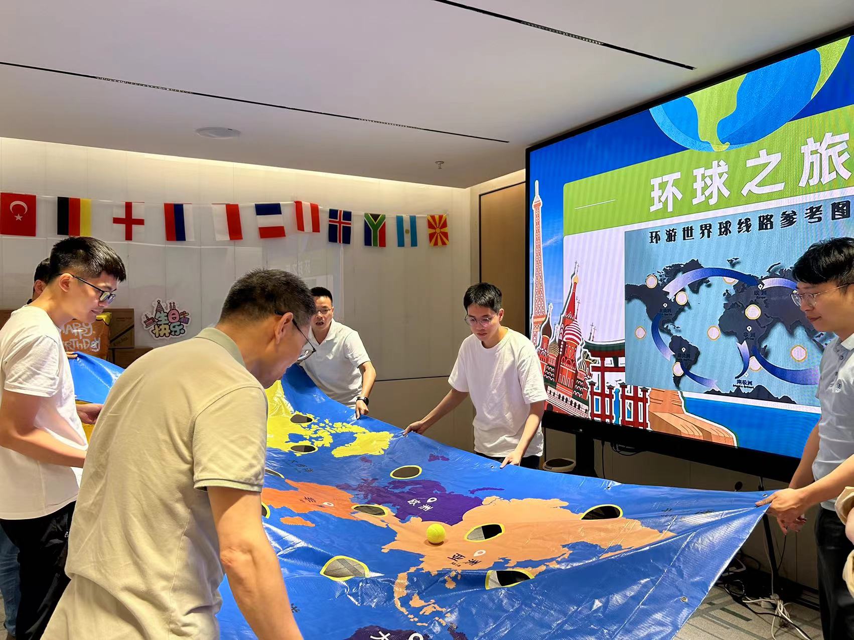 本次生日會(huì)的游戲環(huán)節(jié),為了貼近“環(huán)球”的主題,展現(xiàn)公司作為集團(tuán)國際貿(mào)易橋頭堡的風(fēng)采,壽星們分為“擁抱世界”、“放眼全球”兩個(gè)隊(duì)伍,開始了兩輪精彩對(duì)決!