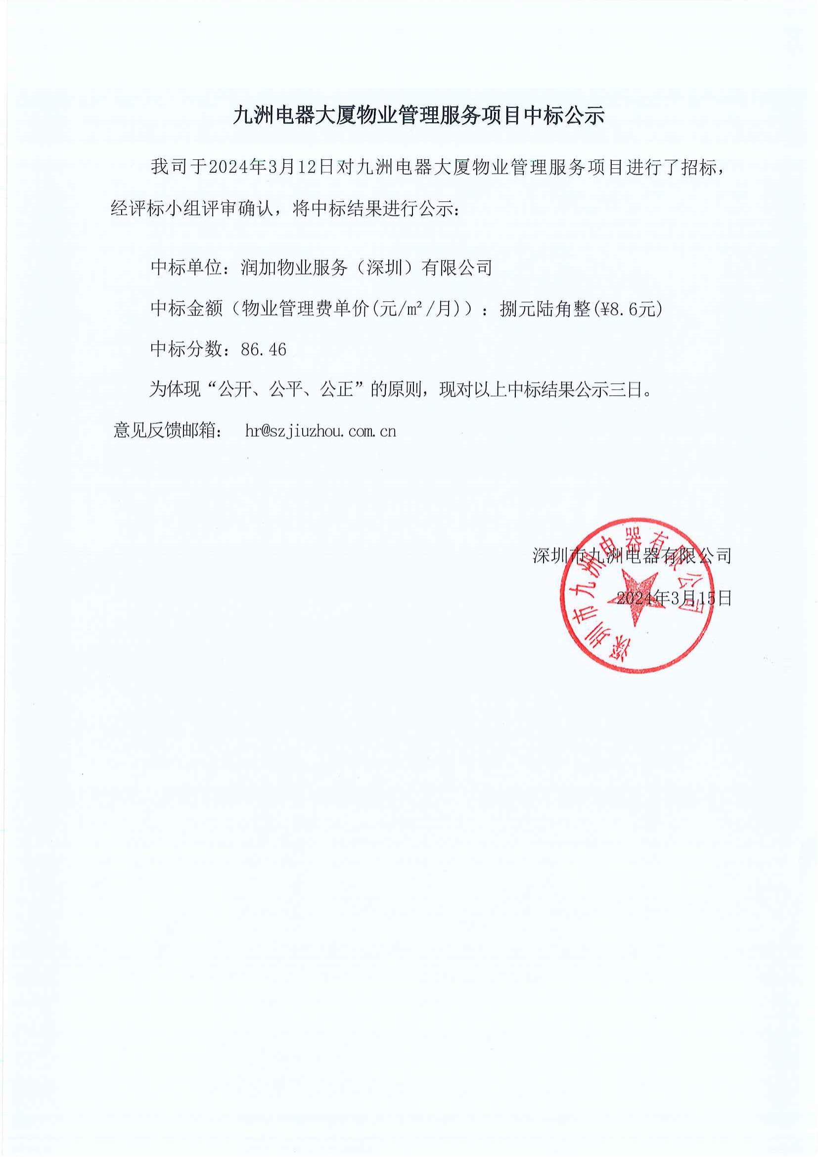 九洲電器大廈物業(yè)管理服務(wù)項(xiàng)目中標(biāo)公示