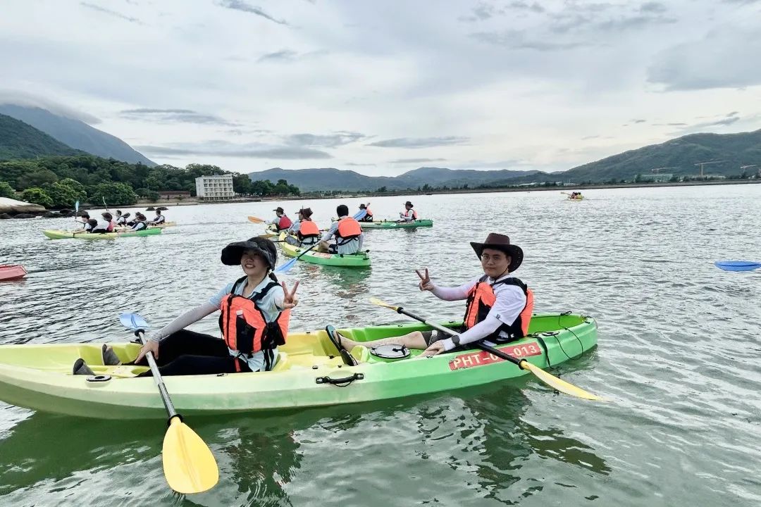 由專業(yè)的皮劃艇教練為大家做皮劃艇專業(yè)動作要領(lǐng)和安全注意事項的培訓(xùn),大家認(rèn)真聆聽并迅速掌握要領(lǐng)。培訓(xùn)結(jié)束后,大家躍躍欲試,穿上救生衣,踏上皮劃艇,撐起長船槳,自由練習(xí),一陣陣歡聲笑語和整齊的“左、右、左、右...”打破了海面的平靜。